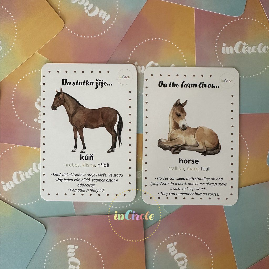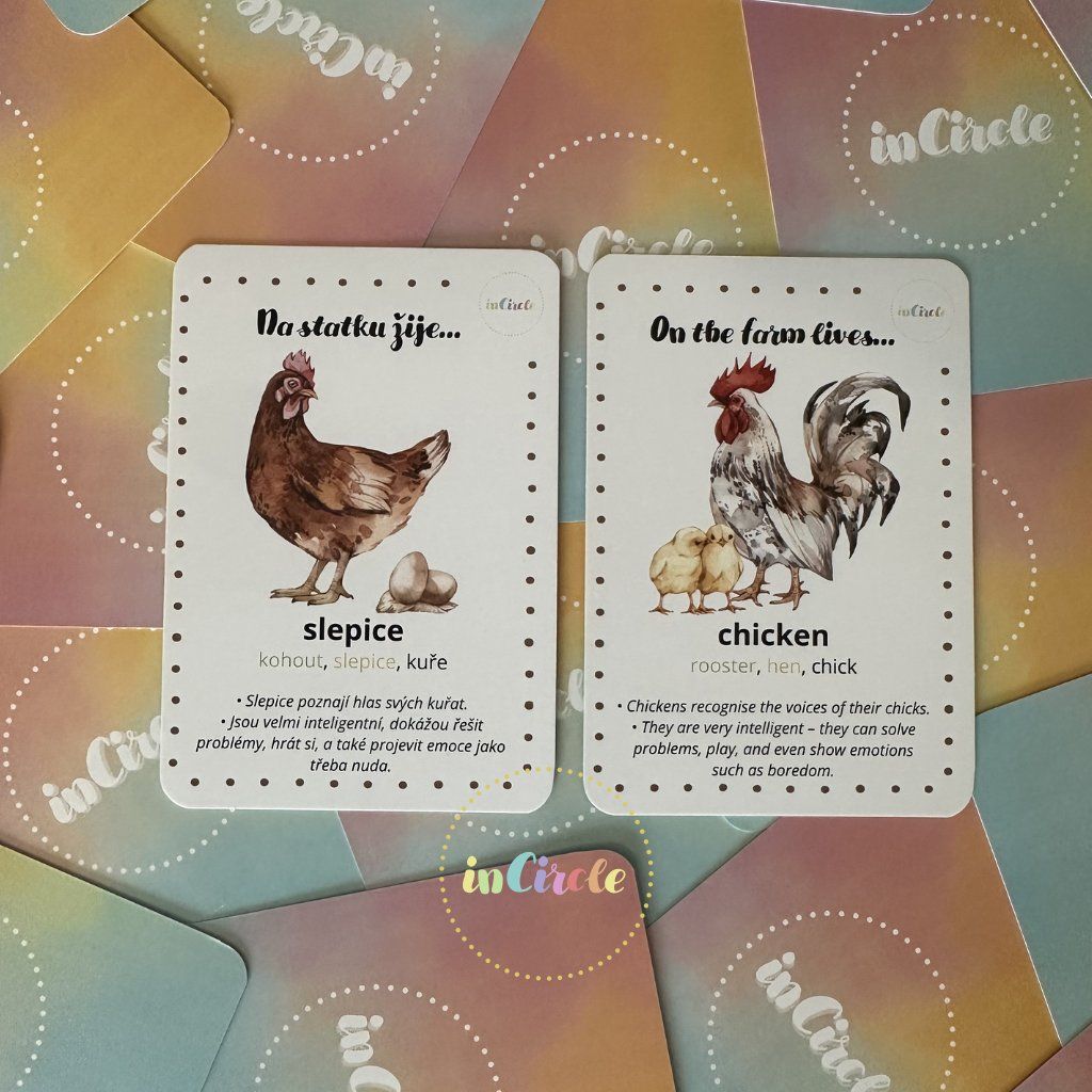 Kartičky Na statku / On the farm pomáhají dětem poznávat hospodářská zvířata a zároveň rozšiřovat slovní zásobu v češtině i angličtině.